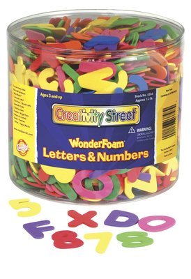 One-half pound of bright, colorful WonderFoam® letters and numbers in a clear plastic storage tub. Pieces are thick enough for easy use by small hands. A great learning tool!