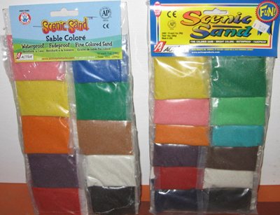 Activa scennic sand 10 colors-1oz bags Deep Black, White, Pink, Vivid Green, Cocoa Brown, Orange, Dk. Blue, Brt. Yellow, Purple, Brt. Red, We still have some of the 12 color bags depicted above but the newer version as shown on the left above has 10 colors.