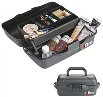 • Includes removable dividers to enhance storage capabilities • Draw-tight latch along with sturdy tongue-and-groove construction • Tip-Guard™ tray that prevents spills The smaller model (15"long by 8.25"wide 6.5"deep) has one adjustable tray wtih inserts making it adaptable for supplies.
