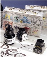 Introductory set of 8 inks, 14ml each, colors include orange, violet, carmine, brown, blue, black india, yellow and green.