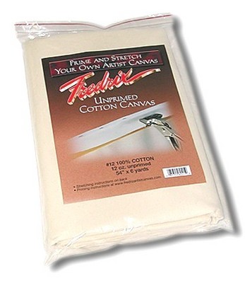 Three yard pieces of 12 oz unprimed Fredrix Dixie cotton duck Fredrix canvas of varying widths folded blanketlike in self-sealing vinyl carriers for easy storage and transport. No more unwieldy rolls with frayed, dirty edges. After cutting the size canvas your project or commission requires refold and store in dirt proof conainer. Other sizes and weights canvas available upon request.