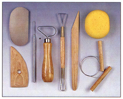 Pottery Tool Kit-Set of 8 basic tools that includes wood potter's rib, synthetic sponge, loop tool, ribbon tool, needle tool, wood modeling tool, wire clay cutter and steel scraper.