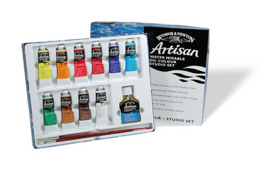 A complete set conaining 10 x 37 ml tubes of Artisan Water Mixable Oil Colurs, a 75 ml bottle of Artisan Linseed Oil, an Azanta Long Handled Brush Flat #2 and an Azanta Round #4 and a products information leaflet.