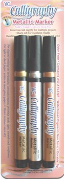 These metallic calligraphy markers are made with waterbased pigment ink and are non-toxic, odorless and contain no Xylene. They have a durable 2mm tip and come in a set containing gold, silver and copper. Perfect for elegant writing on invitations, announcements, greeting cards, signs, awards and certificates. They write on light or dark paper and are water resistant when dry. Gold and Copper inks are acid free.