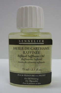 Refined Safflower Oil is the oil used to produce colors with Sennelier extra-fine oil. It yellows less than linseed oil. Clarified vegetable oil, a good drier with low acidity is characterised by resistance to yellowing and has an excellent compatibility with pigments. Because of its pale color, it is recommended to grind with white and clear tones. Mixed with oil colors to accentuate their fluidity, transparency and gloss without altering the hue’s brilliance during drying. It dries more slowly than linseed oil, but may be safely mixed with it. Add 25% maximum to total paint mixture.