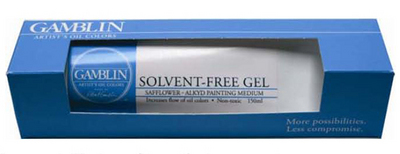 Solvent-Free Gel gives colors more flow and transparency, yet holds the shape of your brushmark. Solvent-Free Gel has a moderately fast drying rate and increases gloss. Made from safflower oil and alkyd resin, Gamblin Solvent-Free Gel is non-toxic and contains no Gamsol or petroleum distillates.