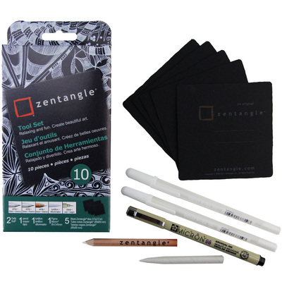 Zentangle Set - 3.5” Black Tile - 10 Pieces - 2 EA Gelly Roll 08 White; 1 EA Pigma Micron 08 Black, White Pencil, 1 Tortillion; 5 EA 3.5” Black Zentangle Tiles