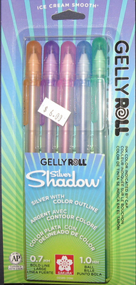 Gelly Roll Silver Shadow™ dual color writes in metallic silver with a brilliant colored border. For the best results, use on bright white, fiber-based, porous papers.