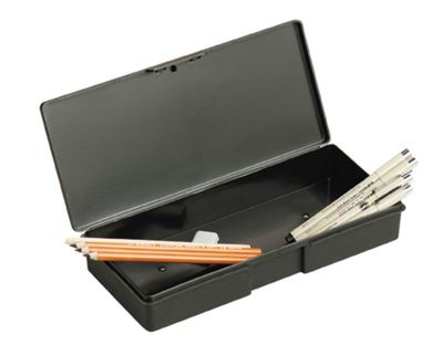 Molded from durable black polypropylene. This box features a "Living Hinge". Great for storing small supplies, markers, pens, and pencils.10.375" x 4.5" x 1.75"