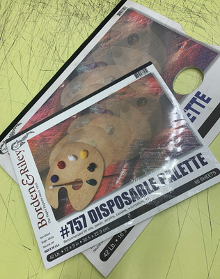 Disposable Paper Palettes provide a full mixing surface of specially plastic-treated, economical paper. Well suited for painting with acrylics, oils, casein, and watercolors. 50 sheets in each tape bound pad. Available in two sizes 9" x 2" and 12" x 16" with thumb hole(larger size only).