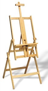 Versatile oiled beechwood easel designed for water colour, oil or pastels. Will tilt forward for glare reduction and for pastel work. Will tilt backwood to form a table for watercolour or to apply gesso/varnish. Quick-release hinges provide for easy conversion. Fully adjustable painting tray and retractable mast. Maximum canvas height 52" Maximum clearance 101" Base width and depth 24"x27.5"