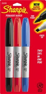 Sharpie's Super Twin Tip features "chisel tip" on one side and "fine tip" on other side. Available in three colors.