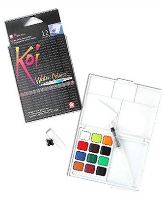 Now you can enjoy all of the great features and benefits of Koi Watercolors in a compact travel size, Pocket Field Sketch Box 12 Half Pan Set. Includes versatile small water brush, with self-contained water cartridge, sponge and mixing wells molded in the cover. New water brush cartridge allows you to have water always accessible when you need it, sponge allows for removing or adding color and cleaning the brush and the mixing wells make it easy to make washes and blend colors.