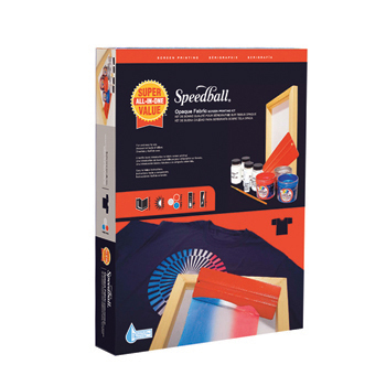 Contents include a 10"x14" screen frame, fabric squeegee, three jars of 4 oz Opaque Fabric Ink in pearlescent colors(silver, raspberry, and blue topaz), 4 oz screen filler, 4 oz drawing fluid, 4 oz diazo screen emulsion with sensitizer, #6 round brush, and instruction booklet. Shipping Weight 6.5 lb