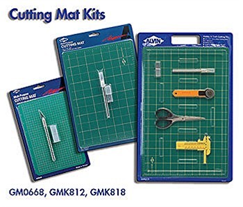 GM0668 - Green mat, 6" x 8 1/2" with art knife and spare blades. Printed grid pattern includes guide lines for 45° and 60° angles, 1/2" grid lines and all four edges full numbered and graduated with 1/8" hash marks that extend beyond the zero base line. GMK812 - Green mat, 8 1/2" x 12" with art knife and spare blades. Printed grid pattern includes guid lines for 45° and 60° angles, 1/2" grid lines and all four edges are fully numbered with 1/8" hash marks that extend beyond the zero base line. GMK818 - Green mat, 12" x 18" with art knife, spare blades, 7" scissors, circle cutter with spare blades and a rotary cutter. Printed grid pattern includes guid lines for 45° and 60° angles, 1/2" grid lines and all four edges are fully numbered with 1/8" hash marks that extend beyond the zero base line.