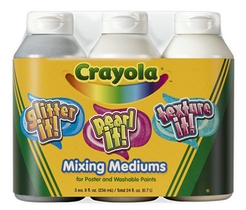 Bring endless creative possibilities to paintings and projects by adding Crayola Tempera Mixing Mediums to tempera, acrylics and washable poster paints. Three 8 oz bottles, one of Glitter It, Pearl It and Texture It.