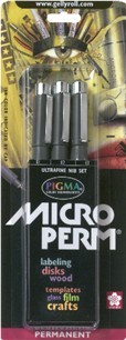 All Black MicroPerm Pens are permanent, write on any surafce including glass, plastic, transparencies, vellum, photographs, CD's, etc. and provide ultrafine lines for precise detail and precision. AP non-toxic are available in 3 sizes: .25MM, .35MM, .45MM and in a three pen set.
