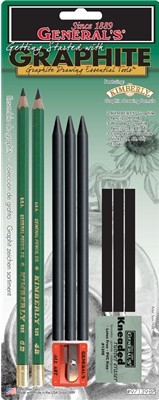General Pencil's Essential Drawing Tools kit consists of: 2 Kimberly Pencils HB,2B 3 Woodless Graphite Pencils 2B, 4B, 6B 3 Compressed Graphite Sticks 2B, 4B, 6B 1 kneaded erase 1 sharpener