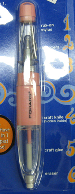 Fiskars Tool Taxifeatures 6 tools in one 7" long case depicted here. Inclides: embossing stylus, tweezers, craft knife(#11), rub-on stylus, glue and applicator and adhesive remover.