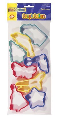 Pack of 8 brightly colored plastic dough/clay cutters. Shapes include star, bell, airplane, butterfly, seal, tree, dolphin and truck.
