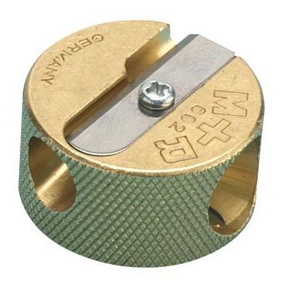 Double-duty, hand-held Brass pencil sharpener with a replaceable blade. Accepts large diameter pencils up to 5/16".