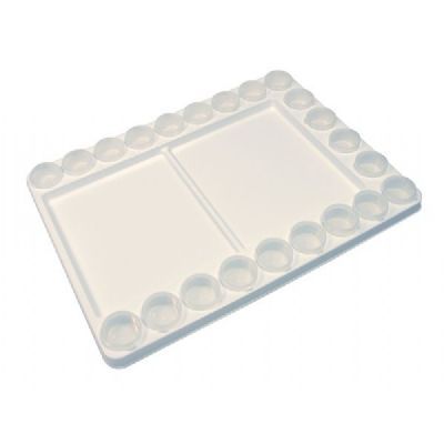 Includes 22  1 3/8" diameter x 3/4" deep removable 25ml cups with hinged lids and (2) 6 5/8" x 7 3/4" mixing wells. Remove the cups to expose 22 usable wells. Overall size: 11 3/4"w x 15 3/4"l.