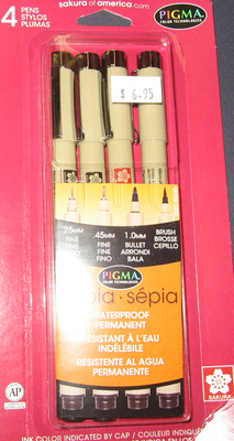 The 4 Pen Sepia Set includes: Brush Pen, 01(.25 mm), 05(.45 mm), 1.0 mm