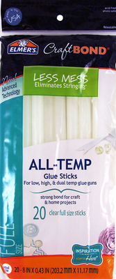 Elmer's All Temp Glue Sticks give your project the professional finish you expect with Elmer’s CraftBond Less Mess Glue Sticks!  This advanced technology formula creates a precise, clear bead eliminating the frustration and clean-up time typically involved with those messy glue strings, allowing you more time to create.