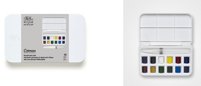 Cotman's Compact Brush Pen set includes 12 Cotman half pans, a  brush pen and a palette cover in a sturdy plastic 3" x 5" fold-up container.