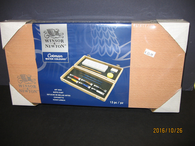 Cotman Water Collours small Wood Box Set is 13" x 6" 2"(approximately)and contains 13 pieces: