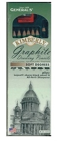 The Kimberly Graphite Pencil Set by General Pencil includes 6 pencils in varying soft degrees (3B,4B,5B,6B,7B,8B)  plus a bonus layout ebony black pencil & pencil sharpener.