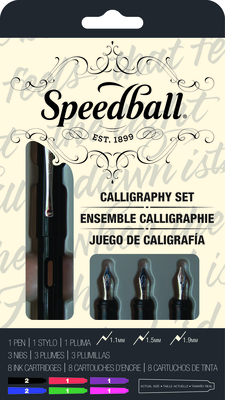Basic Calligraphy Fountain Pen Set: (1) Speedball Calligraphy Fountain Pen; (3) Fountain Pen Nibs (1.1mm, 1.5mm, 1.9mm); and (8) Ink Cartridges-(2)ea. Blue & Black, (1)ea. Red, Purple, Green, Pink.