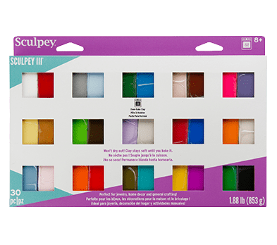 This colored modeling compound is soft and pliable for easy handling. Bakes in a home oven to firm hardness with a smooth matte finish. Great for children to use. Takes tooling well, cna be rolled and cut, extruded through the Sculpey Clay Gun, or formed over armatures such as tin foil, wire and glass. Perfest for small sculptures, jewelry or decorative pieces. Ceritfied Non-toxic.This Sculpey Sampler Pack comes with 30 - 1oz. colors.